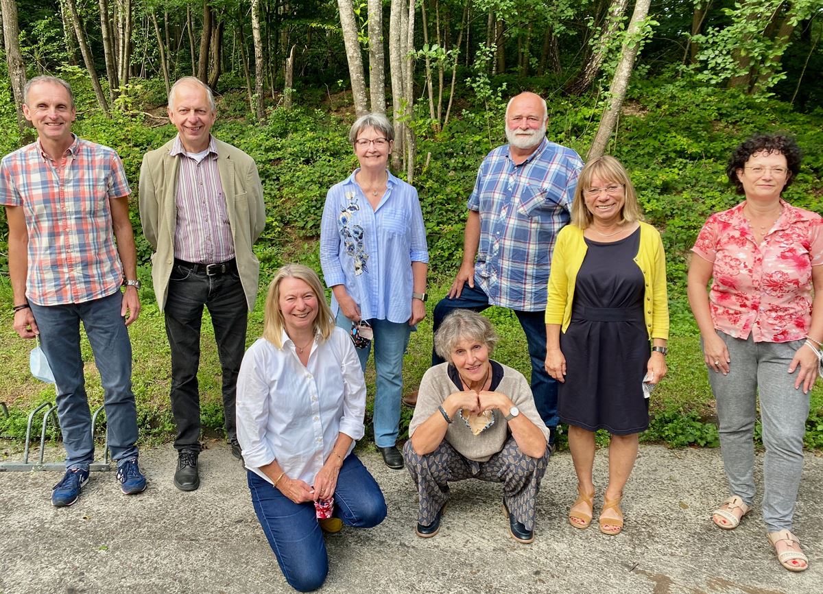 Wir sind begeistert über so viel Interesse: fast 50 DFG-Mitglieder haben am 9. Juli mitten im Montabaurer Stadtwald einen neuen Vorstand gewählt. Von links nach rechts hinter Corona-Mundschutz verborgen: der neue DFG-Vorsitzende Bernhard Gressmann, Beisitzer Ulrich Czerwanski, Beisitzerin Dr. Gabriele Allard-Rudloff, Gudrun Zoll, zuständig für Presse und Internet, die stellvertretende Vorsitzende Rita Krock, Beisitzer (und Koch) Günter von Waechter, Schatzmeisterin Monika Hummelt-Wittke und Beisitzerin Carole Tursini-Selbach.