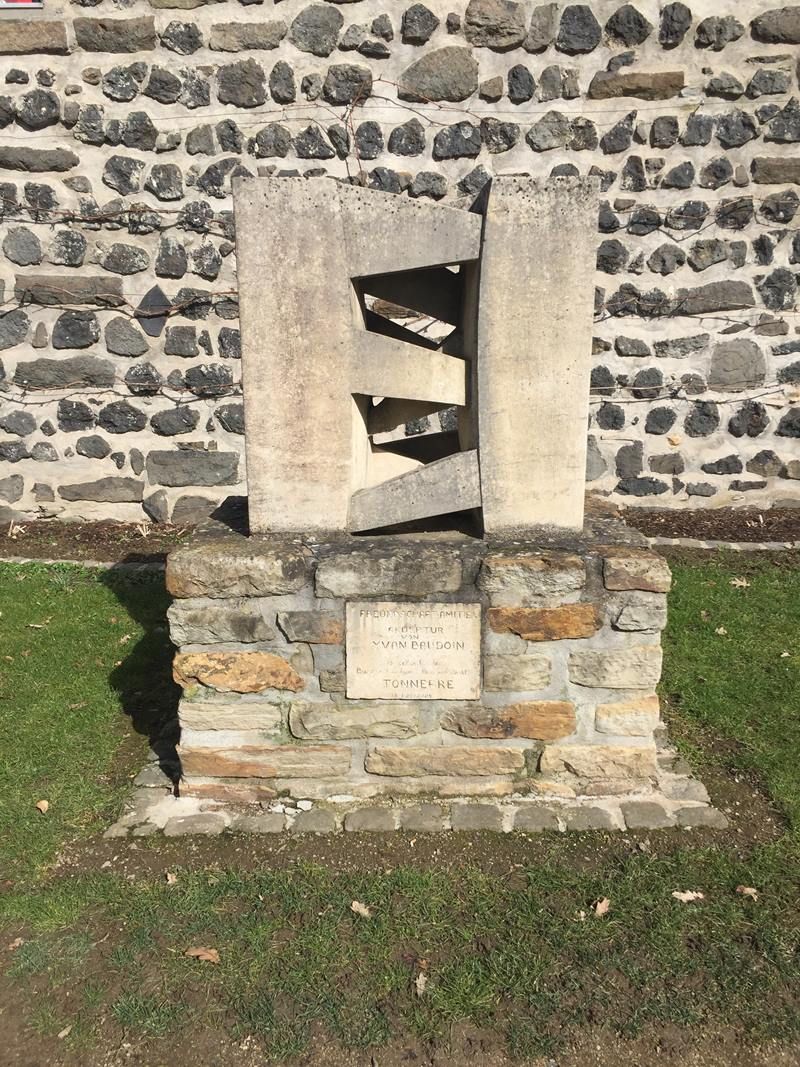 Eine Skulptur des Tonnerrer Bildhauers Yvan Baudoin steht an der Stadtmauer, das Verkehrs-Hinweisschild "Tonnerre" an der Wilhelm-Mangels-Straße.